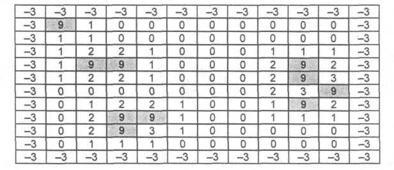 В начале игры каждый элемент массива, соответствующий клеткам игрового поля, может содержать число от 0 до 9. Ноль соответствует пустой клетке, рядом с которой нет мин. Клеткам, в которых нет мин, но рядом с которыми мины есть, соответствуют числа от 1 до 8. Элементы массива, соответствующие клеткам, в которых находятся мины, имеют значение 9. Элементы массива, соответствующие границе поля, содержат -3.