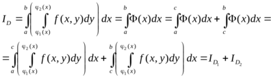 Свойство 1. Если правильную в направлении оси Oy область D разбить на две области D1 и D2 прямой, параллельной оси Оу или оси Ох, то двукратный интеграл ID по области D будет равен сумме таких же интегралов по областям D1 и D2, т. е.