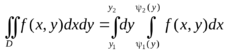I) Область правильная в направлении оси Oy. Область интегрирования D ограничена слева и справа прямыми x = x1 и x = x2 (х2 > x1), а снизу и сверху непрерывными кривыми y = φ1(x) и y = φ2(x) (φ2(x) ≥ φ1(x)), каждая из которых пересекается с вертикалью х = Х (х1 < X < х2) только в одной точке (такая область называется правильной в направлении оси Oy). В области D переменная х меняется от x1 до х2, а переменная у при постоянном х меняется от y = φ1(x) до y = φ2(x). Вычисление интеграла может быть произведено путем сведения к повторному интегралу по формуле