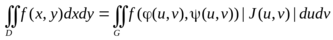 − квадрируемая замкнутая область и f(x, у) − функция, непрерывная в D (или же ограниченная в D и непрерывная в D всюду, кроме некоторого множества площади нуль), то верна следующая формула замены переменных в двойном интеграле: