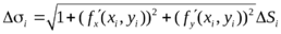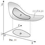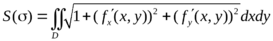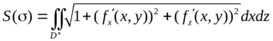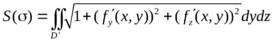 (е) Площадь поверхности в пространстве. Если поверхность σ задана уравнением z = f(x, y) (функция f(x, у) непрерывна и имеет непрерывные частные производные), где