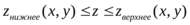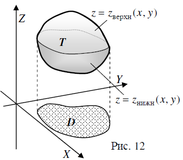 (д) Объем тела в пространстве. Если тело T (рис. 12) проецируется на плоскость XOY в фигуру D и задано неравенствами