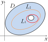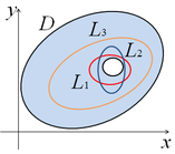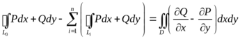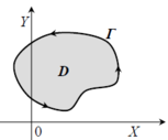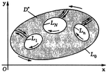 является внешним, а остальные контуры L1, ..., Ln − внутренними (они ограничивают отверстия в области). Отметим, что положительным направлением обхода внешнего контура следует считать движение против часовой стрелки, а положительным направлением обхода внутренних контуров − движение по часовой стрелке, поскольку при таком движении область D, ограниченная этими контурами, остается все время слева. Формула Грина справедлива и для многосвязной области. Ее можно записать в виде
