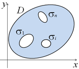 лоскую область, не являющуюся односвязной, называют многосвязной областью. Рассмотрим частный случай многосвязной области, когда граница этой области состоит из конечного числа попарно не пересекающихся контуров. В этом случае один контур
