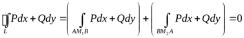 Пусть равенство (1) выполнено для любого контура L, целиком лежащего в области D. Выберем произвольные точки А и В в D и соединим их двумя различными кривыми АМ1В и АМ2В, целиком лежащими в D. Из этих кривых можно составить контур L. В силу предположения и свойств криволинейного интеграла второго рода имеем