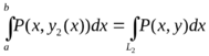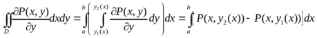 Доказательство. Пусть в плоскости Oxy дана ограниченная замкнутым контуром L правильная в обоих направлениях область D. Пусть эта область ограничена снизу кривой у = y1(х), а сверху кривой у = у2(х), у1(х) ≤ у2(х) (а ≤ х ≤ b). И пусть слева область D ограничена кривой x = x1(y), а справа кривой x = x2(y) (а ≤ х ≤ b).