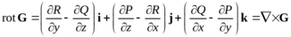 Завихренность векторного поля G(М) в точке M0 в направлении единичного вектора n можно представить как проекцию некоторого вектора ω на направление вектора n. Вектор ω можно определить его проекциями на направления базисных векторов e1, e2, е3. Его называют ротором (иногда вихрем) векторного поля в точке M0 и обозначают rot G(M).