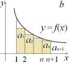 Из рис. 1а видно, что сумма площадей построенных прямоугольников равна сумме sn первых п членов ряда. С другой стороны, ступенчатая фигура, образованная этими прямоугольниками, заключает область, ограниченную кривой y = f(x) и прямыми х = 1, x = n + 1, y = 0; площадь этой области равна