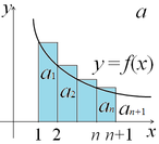 Доказательство. Пусть a = 1. Изобразим члены ряда геометрически, откладывая по оси абсцисс номера 1, 2, 3, ..., n, п + 1, ... членов ряда, а по оси ординат − соответствующие значения членов ряда a1, a2, ..., an, ... (рис. 1a).