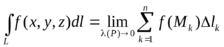 ),не зависящий от способа разбиения линии L на п частей и выбора точек Сk. то этот предел называется криволинейным интегралом первого рода от функции f(x, y, z) по линии L, и обозначается: