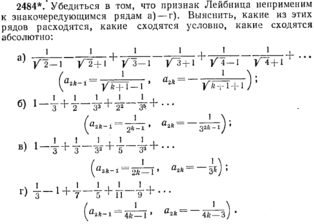 2484*. Убедиться в том, что признак Лейбница неприменим к знакочередующимся рядам а) − г). Выяснить, какие из этих рядов расходятся, какие сходятся условно, какие сходятся абсолютно: