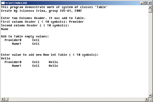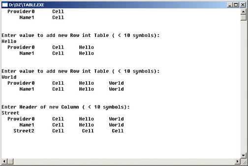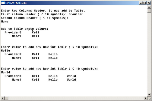Данная программа только демонстрирует основные возможности. При выполнении программы от пользователя требуется ввод названий колонок и добавляемые значения полей таблицы.