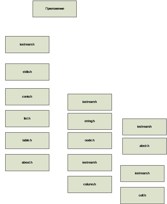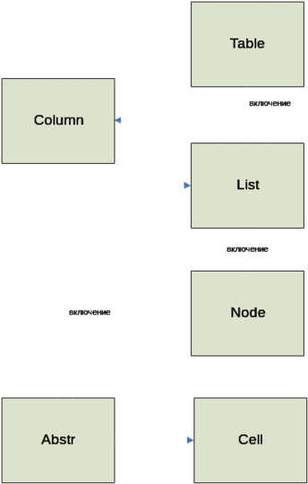Система классов «Таблица» состоит из 6 классов – Abstr(абстрактный класс-строка),Cell (класс ячейка, наследованный от класса строка), Node (класс узел, элемент списка, Включает либо узел, либо строку-название), List (список, состоящий из узлов, наследован от абстрактного класса строка),Column(столбец-спиоск узлов,с названием) и Table (класс Таблица).