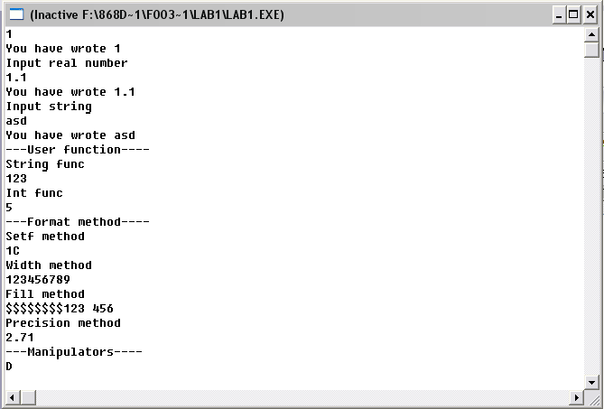 5.Продемонстрировать, в проихвольной форме, использование всех методов классов для объектов CIN и COUT: setf (для целого числа при выводе в шестнадцатеричном виде), width (для строки), fill (для строки) и precision (для действительного числа).