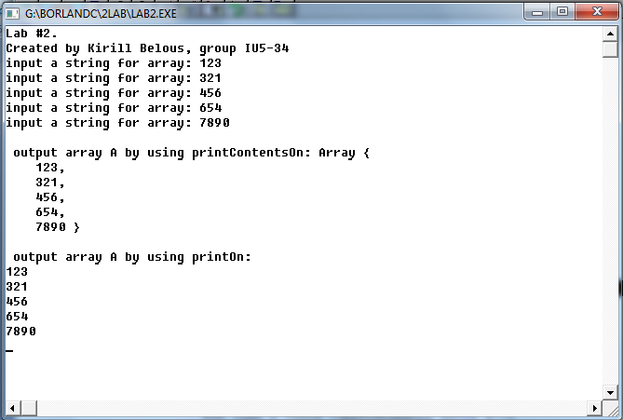 Выполнить перегрузку метода printOn для элементных объектов (String, Date, Time), включаемых в массив, при этом изменить формат распечатки отдельных объектов по сравнению со стандартным форматом. Для этого на основе элементного класса нужно создать новый класс c перегруженным методом. Править исходные тексты файлов BC++ не допускается. Продемонстрировать распечатку массива с новыми элементами с помощью методов printOn и printContentsOn для массива.