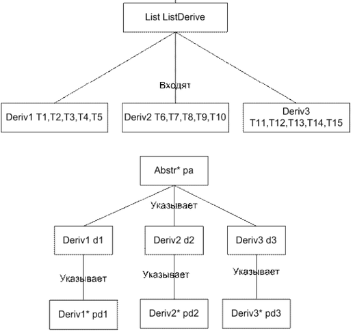 Выполнить распечатку списка с помощью одного цикла (с использованием класса LISTITERATOR см. 3ЛР) и функции print, перегруженной в классах Deriv1 ,Deriv2 и Deriv3 (используя методы current, restart, int) и вычисляемого указателя на базовый класс (pa1). Для примера формирования ссылки: (( Absrt*) &AI.current())->print();