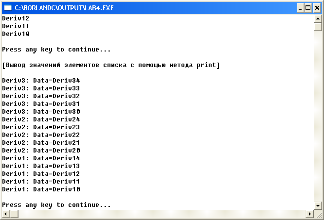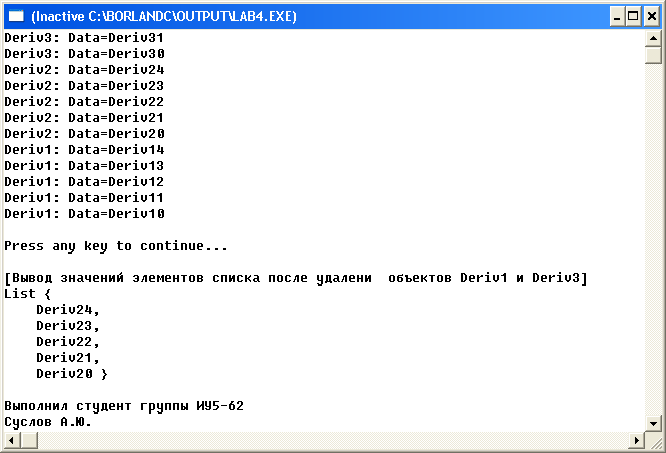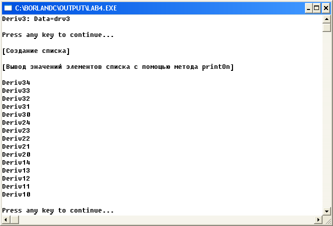 cout<<endl<<endl<<"[Вывод значений элементов списка после удаления объектов Deriv1 и Deriv3]"<<endl;