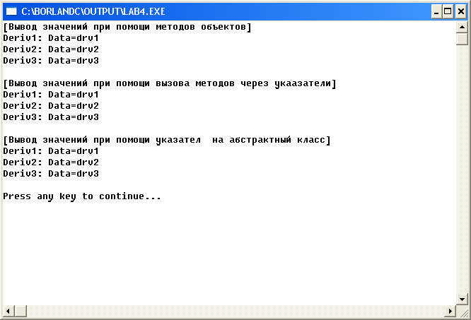 cout<<endl<<"[Вывод значений при помощи указателя на абстрактный класс]"<<endl;