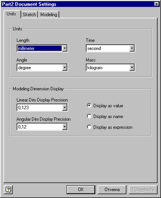 Первая закладка Units (она как раз и представлена на рис. 3) позволяет изменить единицы измерения длины, углов, времени, массы. Кроме этого, здесь можно менять точность представляемых чисел. И, наконец, присутствуют переключатели, с помощью которых возможно изменение представления размеров на эскизах:
