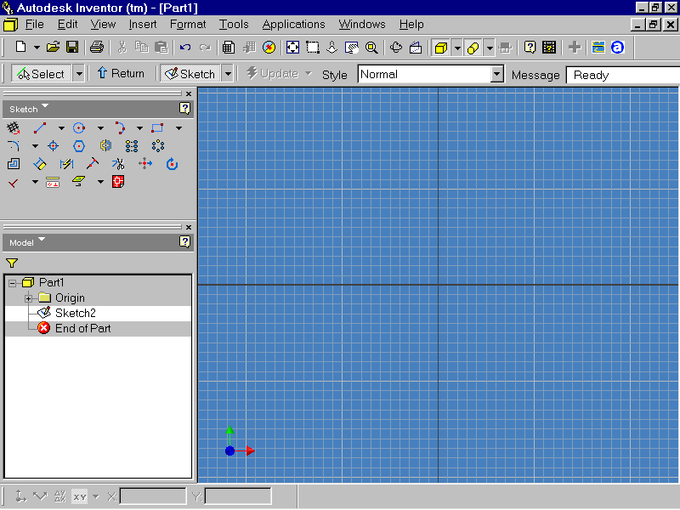 Начнем с режима построения одной детали - файл .ipt. Выбор осуществляется двойным щелчком курсора на соответствующей пиктограмме. После некоторой паузы на экране появляется изображение, представленное на рис. 2.1.