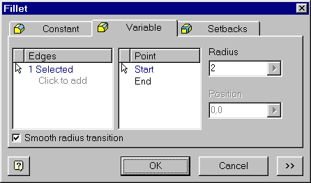 Закладка Variable (рис. 5.20) обеспечивает скругление переменным радиусом. В этом случае сначала нужно указать целую замкнутую кромку, которую следует подвергнуть операции скругления.