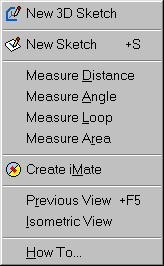 Здесь есть возможность быстрого переключения в режим построения 3-х мерного эскиза New 3D Sketch, 2-х мерного эскиза New Sketch, различных измерений. Возможность специальных ограничений на сборку Create iMate, выбора удобной точки зрения на объект и выход в справочную систему.