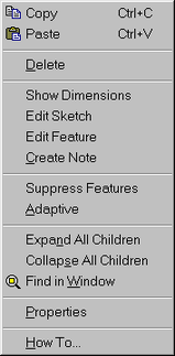 Во время выполнения всех операций построения, продемонстрированных в этом разделе, Вы должны были уделять свое внимание не только содержимому рабочей области экрана, но и содержимому браузера. По мере построения нужных конструктивных элементов в браузере детали появлялись все новые веточки. И по поводу любой из них система предоставляет ряд возможностей, которые перечислены в соответствующем контекстном меню. Это контекстное меню можно увидеть, если подвести курсор в имени любого конструктивного элемента в браузере (или можно сказать – к имени операции формообразования) и нажать правую кнопку мыши. Вид такого контекстного меню представлен на рис. 3.26.