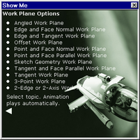 Кроме этого, следует отметить, что система всегда готова предоставить Вам подсказки по этим построениям. Достаточно только вызвать одну из перечисленных выше команд (например, построение рабочей плоскости) и тут же нажать на клавишу F1. В ответ система предоставляет окно с перечислением всех возможных способов построения рабочих плоскостей (рис. 4.2).