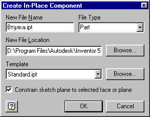 Сразу после вызова команды появляется диалоговое окно (рис. 4). В этом окне мы должны указать системе имя файла будущей детали. Действительно, после того, как мы завершим проектирования новой детали, ее изображение останется в файле сборки. Но кроме этого, для нее будет создан специальный файл, в котором данная деталь будет храниться индивидуально. В этом файле будут отслеживаться все изменения, которым мы, возможно, будем ее подвергать.