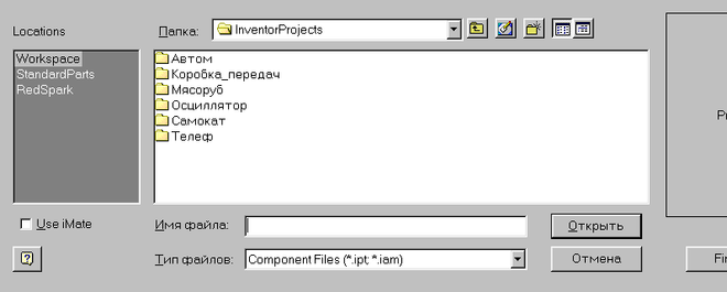 Команда называется Place Component. Это самая первая пиктограмма, представленная на рис. 1. В ответ на вызов этой команды система высвечивает диалоговое окно (рис. 3). В этом окне Вам предоставляется возможность указать - из какого каталога следует вызвать файл уже готовой детали c расширением .ipt. Когда Вы указываете на имя какой-либо детали, справа в специальном окне система высвечивает ее изображение, что удобно.