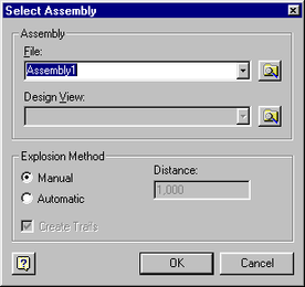 В поле File этого окна необходимо указать имя файла сборки, для которой Вы намереваетесь создавать презентационную схему. В поле Design View следует уточнить – какой именно вид данного сборочного узла Вы предпочитаете превратить в презентационную схему. В нижней части этого диалогового окна еще нужно указать: в каком режиме (ручном или автоматическом) Вы намерены построить презентационную схему. И если Вы предпочтете автоматический режим, то еще следует указать – на какое расстояние друг от друга следует разносить детали (Distance) и нужно ли при этом изображать траектории их перемещения (Create Trails).