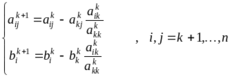 Этап 1 - прямой ход, заключающийся в последовательном исключении неизвестных из уравнений, т.е. из 1-го уравнения выражается x1 и подставляется в уравнения 2…n. Затем из второго уравнения исключается x2 и подставляется в уравнения 3…n и т.д. Т.о. осуществляется последовательное исключение неизвестных x1, …, xn-1. Прямой ход выполняется за (n-1) шагов, на каждом k-ом шаге исключается неизвестная xk из уравнений, начиная с (k+1)-го и заканчивая n - ым, по формулам: