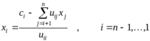 Этап 2 - обратный ход. Состоит из n-1 стадий обратной подстановки снизу вверх. Из последнего уравнения находят значение xn, подставляют в предыдущее уравнение, из которого находят xn-1 и т.д. по формуле