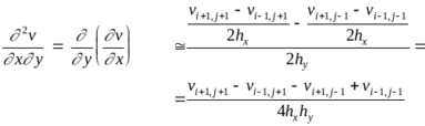 Аппроксимация смешанной производной производится комбинированием двух центральных разностей по оси x и одной по оси y