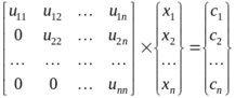 Здесь i - номер обрабатываемой строки, j - номер обрабатываемого столбца, k - номер шага исключения. В результате прямого хода матрица [A] преобразуется в верхнетреугольную матрицу [U], а вектор {B} в вектор {С}, система уравнений при этом будет иметь вид: