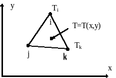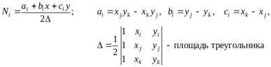 Для двумерных симплексных элементов - треугольников, интерполяционный (апроксимирующий) полином имеет вид (здесь в качестве неизвестной функции используем распределение температуры в плоской области):