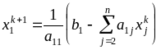 Подставив полученное значение x1k+1 во второе уравнение вместо x1 и по прежнему считая величины неизвестных под знаком суммы равными их значениям на предыдущей итерации, получим уравнение с одним неизвестным для нахождения x2k+1.