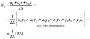 Формулы для Nj, Nk получают из выражений для Ni круговой перестановкой индексов. Функции N получили названия функций формы. Их отличительная особенность - они равны 1 в том узле, индекс которого носят и равны 0 во всех остальных узлах элемента. Например для узла i