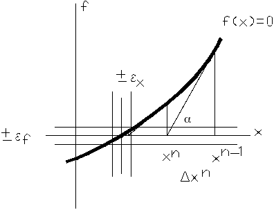 Суть применяемого метода Ньютона легко представить графически для функции одной переменной f(x)=0. Он заключается в выборе начальной точки, построении касательной к кривой в этой точке. Если решение не найдено, то точка пересечения касательной с осью абсцисс считается точкой новой итерации и процедура повторяется. Условием получения решения является выполнение системы неравенств по невязкам и приращениям для n - ой итерации (здесь ||x|| - норма вектора для многомерного случая):