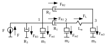 Изобразим фазовые переменные типа потока (сил F) для каждого из элементов и составим топографические уравнения (уравнения равновесия Даламбера) для каждого из узлов эквивалентной схемы (ЭС), принимая за положительное направления воздействия системы на элемент поток, который «втекает» в элемент.