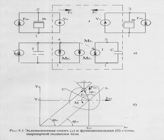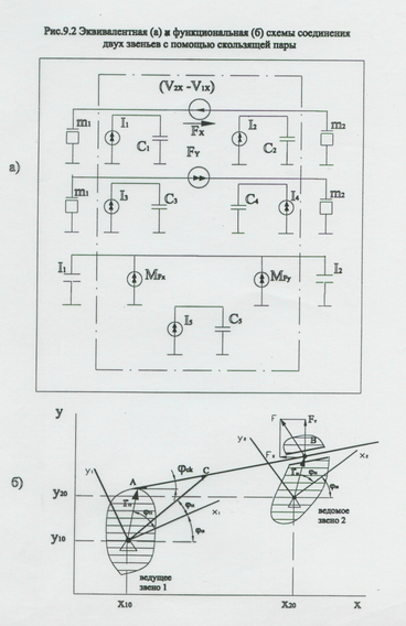 В исходном положении углы φ10 и φ20 , связанные с системами координат (х1,у1) и (х2 ,у2 ) центров тяжести элементов 1 и 2, равны и остаются таковыми при движении, также равны и угловые скорости тел 1 и 2 (ω1 = ω2). На эквивалентной схеме (см рис.9.2а) данное условие отражено в виде вращательной подсистемы.