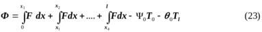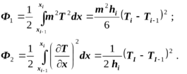 Рассмотрим вид интегрирования на i-ом конечном элементе составляющих уравнения (23) при подстановке соотношений (24). Полагаем Ф = Ф1 + Ф2 , тогда