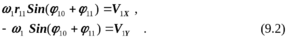 Продифференцировав уравнение (9.4) по времени t, получим на месте координат ( х ,у ) их производные по времени, то есть скорости VХ1 ,VY1 и т. п. Далее можно ввести замену VВХ =V2X , VBY = VY2, учитывая, что точка В принадлежит звену 2, и записать преобразованное уравнение в виде:
