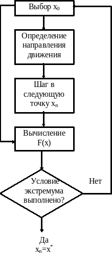 В многих случаях целевая функция может быть определена алгоритмически, т.е. получена из решения математической модели объекта. Для этого используют так называемую процедуру поисковой оптимизации (см ниже), т.е. последовательного приближения выходных параметров ТО к оптимальным значениям (целевая функция приближается к оптимальной заданной точке). На представленном ниже рисунке,- алгоритм схемы расчета целевой функции, определенной из математической модели: