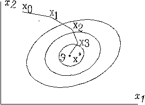 | x1 - точка экстремума вдоль направления параллельного 1 координатной оси из точки x0 x2 - точка экстремума вдоль направления параллельного 2 координатной оси из точки x1 Поиск прекращается, если из точки x* нельзя сделать ни одного шага hmin так, чтобы F(x*+hmin)<F(x*). Здесь hmin- малое наперед заданное число. |