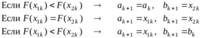 Известные методы уменьшения интервала неопределенности на каждом (k-ом) шаге оптимизации сводятся к выбору двух новых точек x1k и x2k внутри интервала [ak, bk ], затем определению в этих точках значений целевой функции и выбору нового интервала неопределенности согласно алгоритму