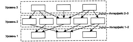 При декомпозиции часто используют многоуровневый подход. Он заключается в следующем. Все множество модулей разбивают на уровни. Уровни образуют иерархию, то есть имеются вышележащие и нижележащие уровни (рис. 1.2). Множество модулей, составляющих каждый уровень, сформировано таким образом, что для выполнения своих задач они обращаются с запросами только к модулям непосредственно примыкающего нижележащего уровня. С другой стороны, результаты работы всех модулей, принадлежащих некоторому уровню, могут быть переданы только модулям соседнего вышележащего уровня. Такая иерархическая декомпозиция задачи предполагает четкое определение функции каждого уровня и интерфейсов между уровнями. Интерфейс определяет набор функций, которые нижележащий уровень предоставляет вышележащему. В результате иерархической декомпозиции достигается относительная независимость уровней, а значит, и возможность их легкой замены.