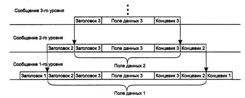 После формирования сообщения прикладной уровень направляет его вниз по стеку представительному уровню. Протокол представительного уровня на основании информации, полученной из заголовка прикладного уровня, выполняет требуемые действия и добавляет к сообщению собственную служебную информацию - заголовок представительного уровня, в котором содержатся указания для протокола представительного уровня машины-адресата. Полученное в результате сообщение передается вниз сеансовому уровню, который в свою очередь добавляет свой заголовок, и т. д. (Некоторые реализации протоколов помещают служебную информацию не только в начале сообщения в виде заголовка, но и в конце, в виде так называемого «концевика».) Наконец, сообщение достигает нижнего, физического уровня, который собственно и передает его по линиям связи машине-адресату. К этому моменту сообщение «обрастает» заголовками всех уровней (рис. 1.5).