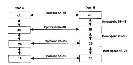 На рис. 1.3 показана модель взаимодействия двух узлов. С каждой стороны средства взаимодействия представлены четырьмя уровнями. Процедура взаимодействия этих двух узлов может быть описана в виде набора правил взаимодействия каждой пары соответствующих уровней обеих участвующих сторон. Формализованные правила, определяющие последовательность и формат сообщений, которыми обмениваются сетевые компоненты, лежащие на одном уровне, но в разных узлах, называются протоколом.