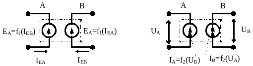 При этом источники фазовой переменной типа потенциала, зависят от потоков через источник другой ветви, а источники фазовой переменной типа потока - от разности потенциалов на источнике фазовой переменной типа потока в другой ветви.